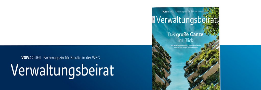 Verwaltungsbeiräte sind oft fachfremd. Sie sind mit den Vorgängen und Notwendigkeiten der Wohnungsverwaltung nur bedingt vertraut. Das Fachmagazin „VDIVAKTUELL Verwaltungsbeirat“ schließt diese Lücke. Es erscheint einmal jährlich im Oktober und informiert mit einem kompakten Fachwissen zu allen relevanten Themen rund um das Wohnungseigentum und die Verwaltung der Objekte von Wohnungseigentümergemeinschaften.